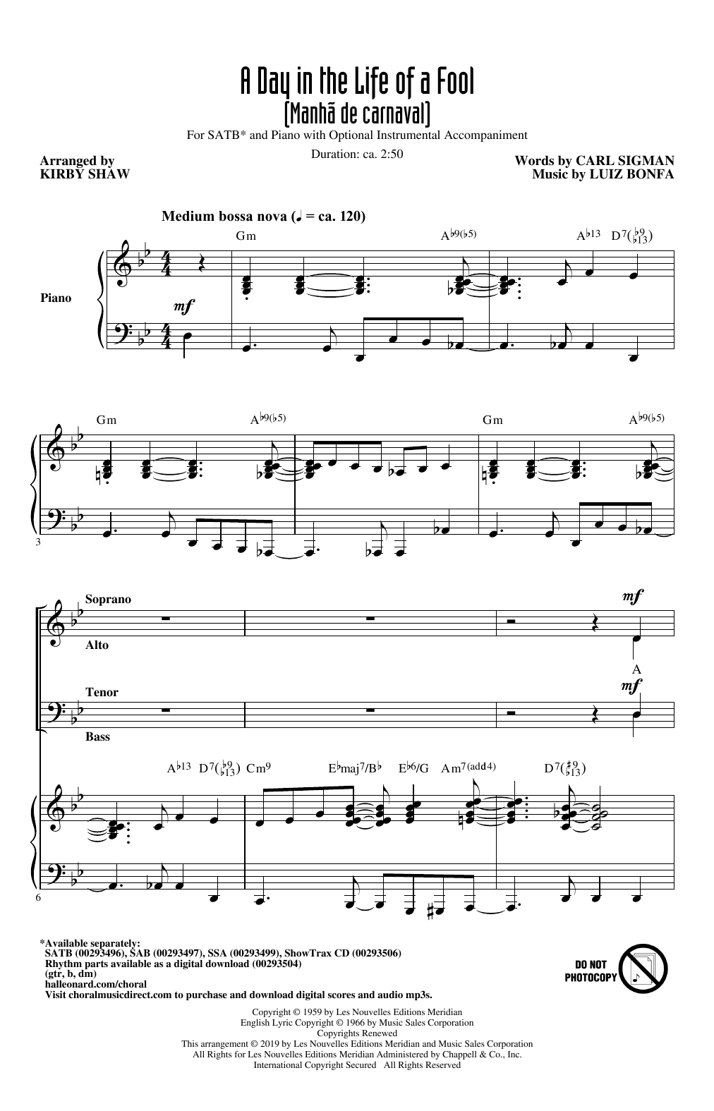 Download or print Carl Sigman & Luiz Bonfa A Day In The Life Of A Fool (Manha De Carnaval) (arr. Kirby Shaw) sheet music, chords and digital score arranged for SAB Choir. This Jazz score includes 10 page(s).