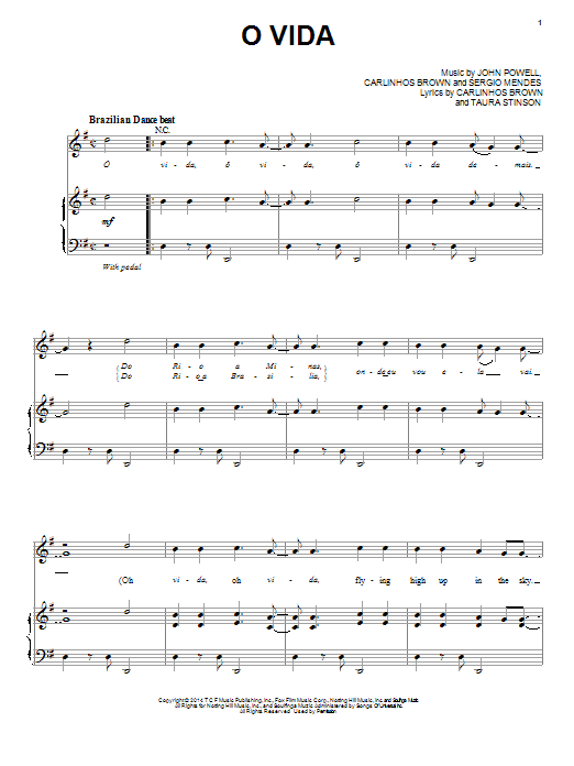 Download or print Carlinhos Brown and Nina de Freitas O Vida sheet music, chords and digital score arranged for Piano, Vocal & Guitar Chords (Right-Hand Melody). This Film/TV score includes 7 page(s).