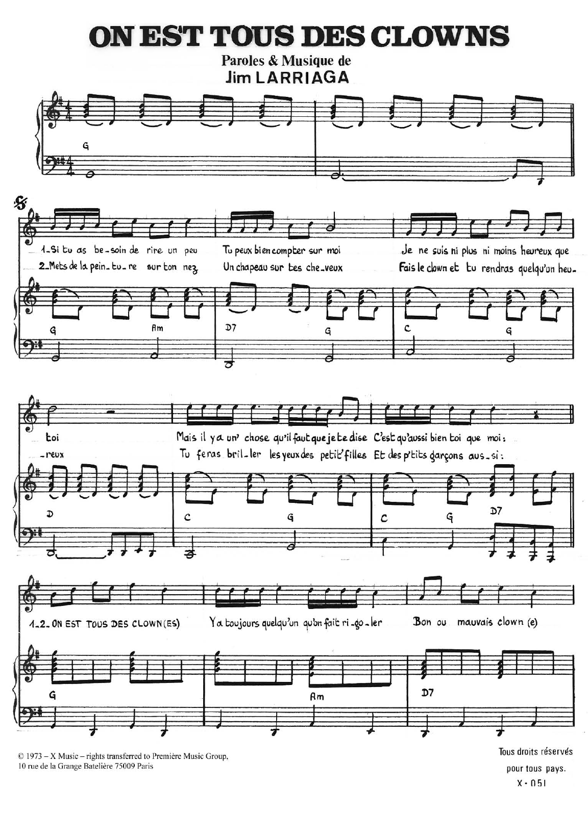 Download or print Carlos On Est Tous Des Clowns sheet music, chords and digital score arranged for Piano & Vocal. This Pop score includes 3 page(s).