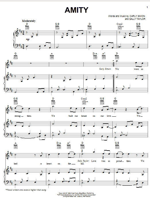 Download or print Carly Simon Amity sheet music, chords and digital score arranged for Piano, Vocal & Guitar Chords (Right-Hand Melody). This Pop score includes 5 page(s).