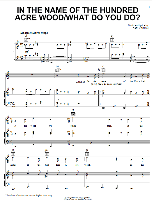 Download or print Carly Simon In The Name Of The Hundred Acre Wood sheet music, chords and digital score arranged for Piano, Vocal & Guitar Chords (Right-Hand Melody). This Children score includes 6 page(s).