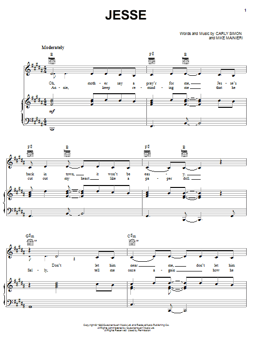 Download or print Carly Simon Jesse sheet music, chords and digital score arranged for Guitar Chords/Lyrics. This Folk score includes 3 page(s).