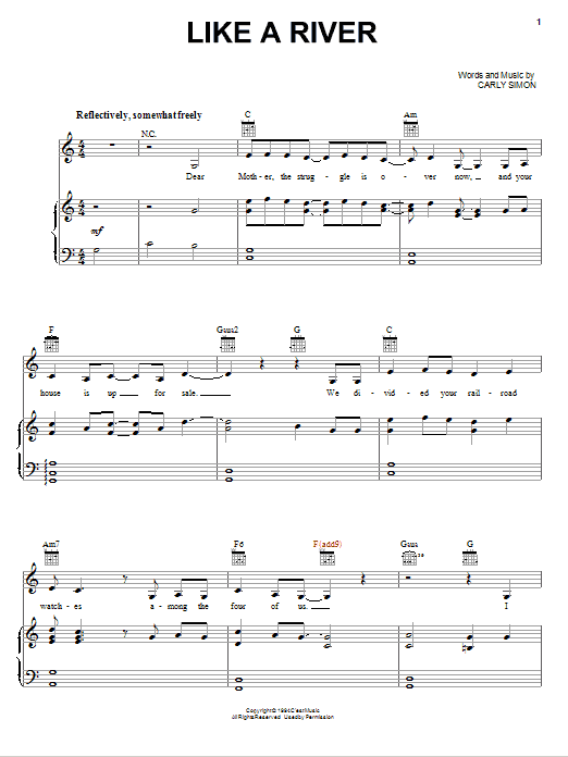 Download or print Carly Simon Like A River sheet music, chords and digital score arranged for Piano, Vocal & Guitar Chords (Right-Hand Melody). This Pop score includes 13 page(s).