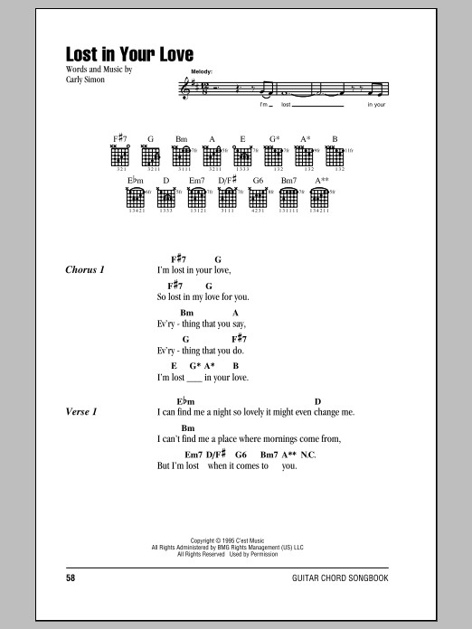 Download or print Carly Simon Lost In Your Love sheet music, chords and digital score arranged for Guitar Chords/Lyrics. This Folk score includes 2 page(s).