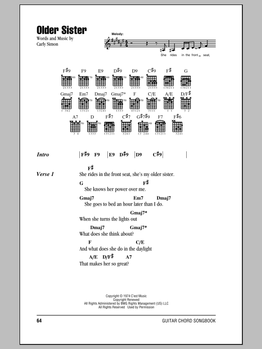 Download or print Carly Simon Older Sister sheet music, chords and digital score arranged for Guitar Chords/Lyrics. This Folk score includes 3 page(s).