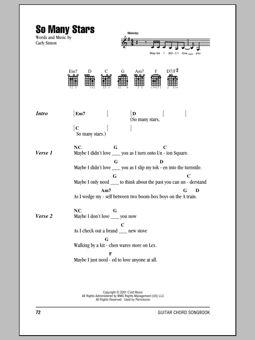 Download or print Carly Simon So Many Stars sheet music, chords and digital score arranged for Guitar Chords/Lyrics. This Folk score includes 3 page(s).