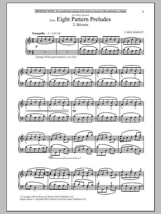 Download or print Carol Barratt Eight Pattern Preludes, 2. Reverie sheet music, chords and digital score arranged for Piano Solo. This Classical score includes 3 page(s).