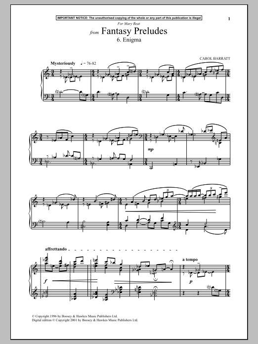 Download or print Carol Barratt Fantasy Preludes, 6. Enigma sheet music, chords and digital score arranged for Piano Solo. This Classical score includes 2 page(s).