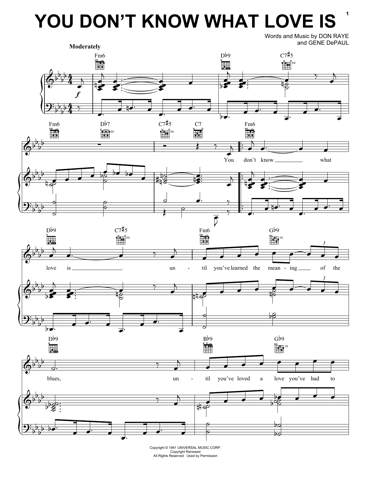 Download or print Carol Bruce You Don't Know What Love Is sheet music, chords and digital score arranged for Real Book – Melody & Chords – C Instruments. This Jazz score includes 1 page(s).