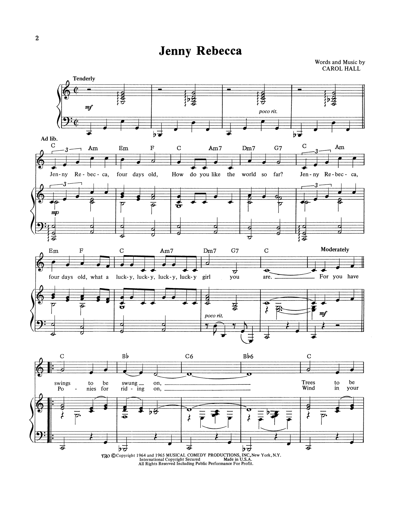 Download or print Carol Hall Jenny Rebecca sheet music, chords and digital score arranged for Piano, Vocal & Guitar Chords (Right-Hand Melody). This Pop score includes 3 page(s).