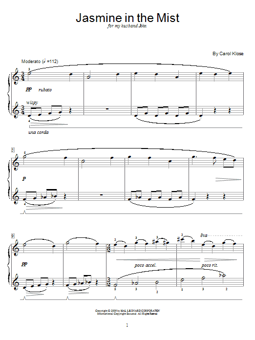 Download or print Carol Klose Jasmine In The Mist sheet music, chords and digital score arranged for Educational Piano. This New Age score includes 6 page(s).