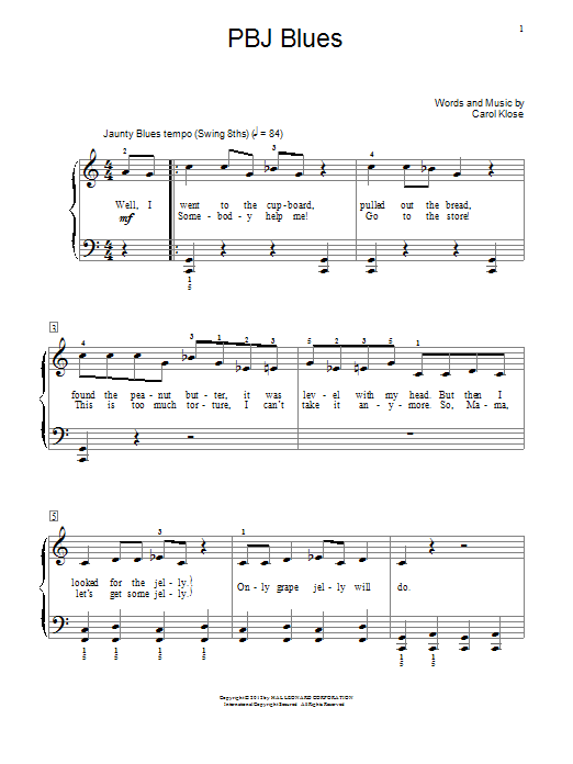 Download or print Carol Klose PBJ Blues sheet music, chords and digital score arranged for Educational Piano. This Pop score includes 2 page(s).