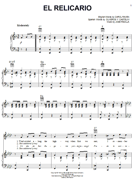 Download or print Carol Raven El Relicario (Shrine Of Love) sheet music, chords and digital score arranged for Piano, Vocal & Guitar Chords (Right-Hand Melody). This Jazz score includes 5 page(s).