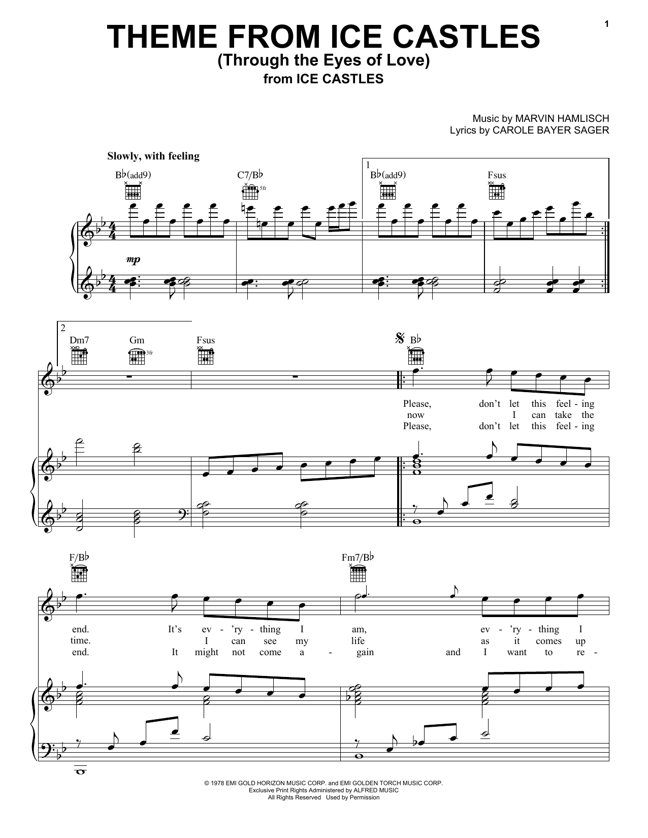 Download or print Carole Bayer Sager Theme From Ice Castles (Through The Eyes Of Love) sheet music, chords and digital score arranged for Piano Solo. This Love score includes 4 page(s).