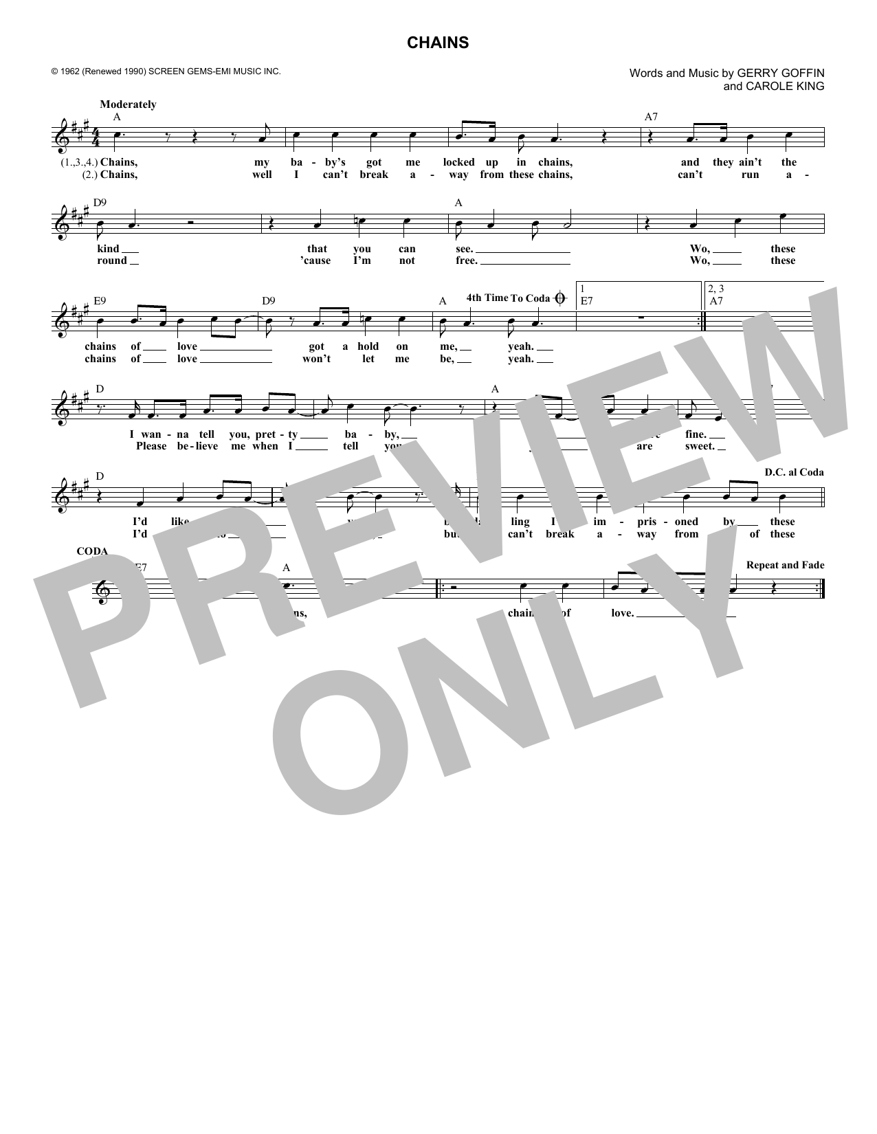 Download or print Carole King Chains sheet music, chords and digital score arranged for Ukulele. This Pop score includes 3 page(s).