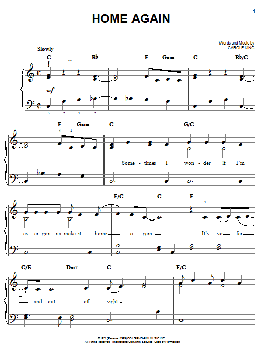 Download or print Carole King Home Again sheet music, chords and digital score arranged for Easy Piano. This Pop score includes 6 page(s).