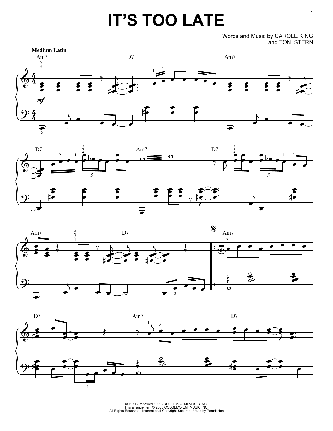 Download or print Carole King It's Too Late [Jazz version] (arr. Brent Edstrom) sheet music, chords and digital score arranged for Piano Solo. This Pop score includes 5 page(s).