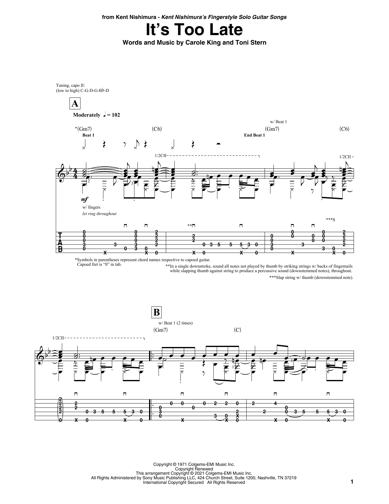 Download or print Carole King It's Too Late (arr. Kent Nishimura) sheet music, chords and digital score arranged for Solo Guitar. This Pop score includes 7 page(s).