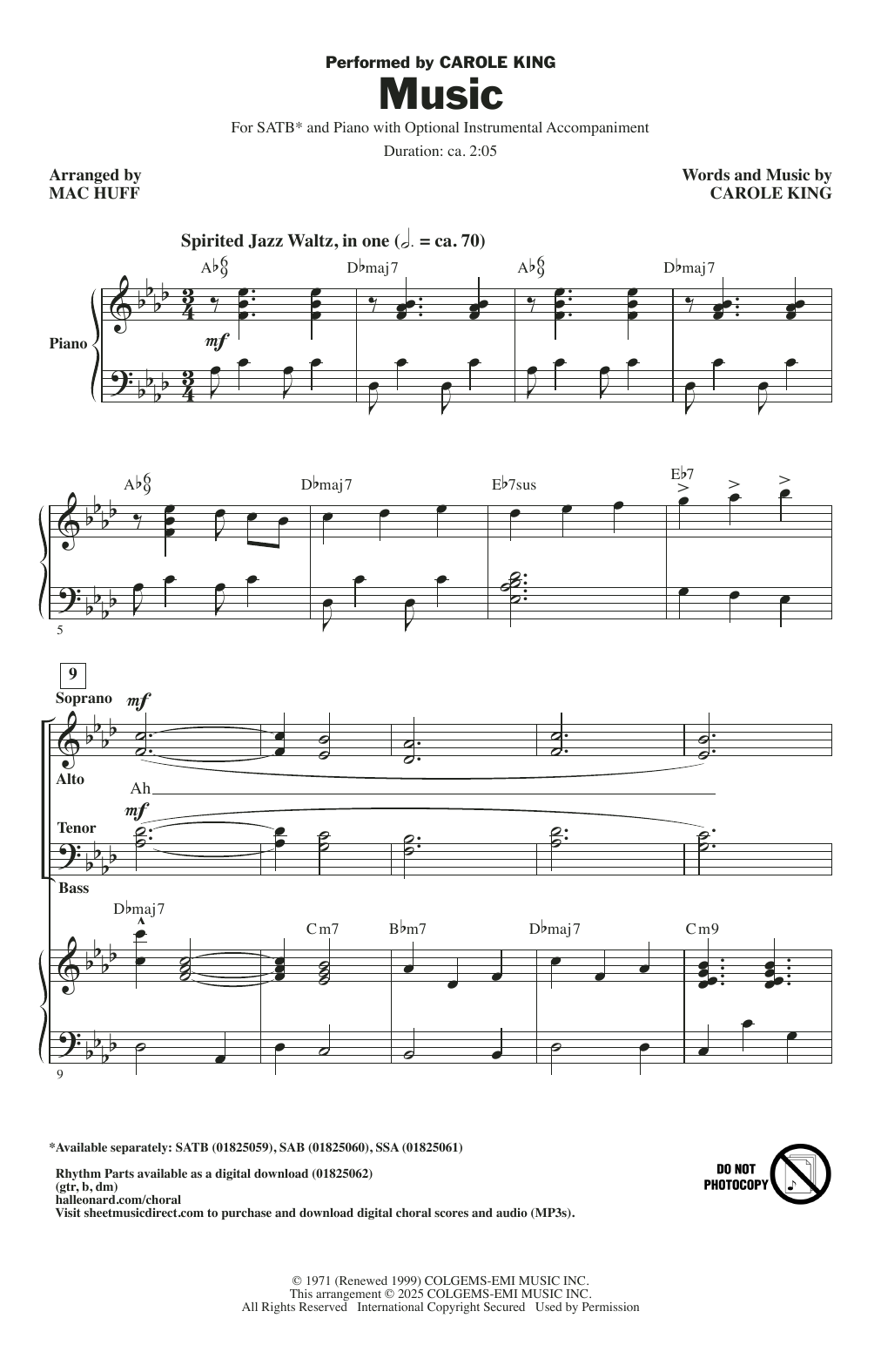 Download or print Carole King Music (arr. Mac Huff) sheet music, chords and digital score arranged for SSA Choir. This Pop score includes 11 page(s).