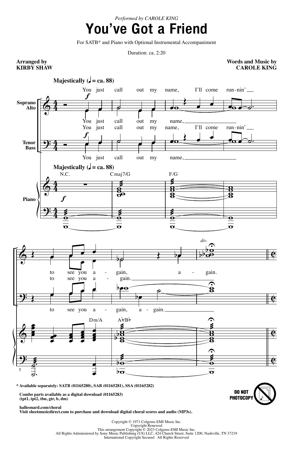 Download or print Carole King You've Got A Friend (arr. Kirby Shaw) sheet music, chords and digital score arranged for SSA Choir. This Pop score includes 10 page(s).
