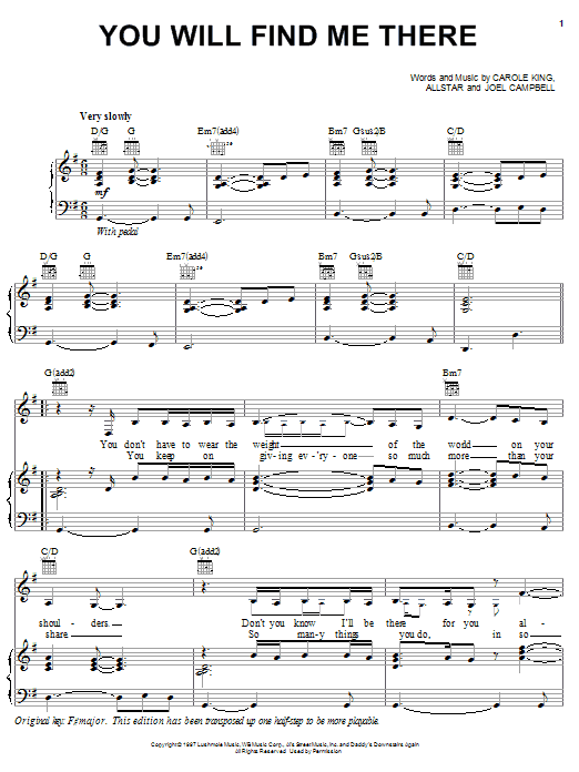 Download or print Carole King You Will Find Me There sheet music, chords and digital score arranged for Piano, Vocal & Guitar Chords (Right-Hand Melody). This Pop score includes 5 page(s).