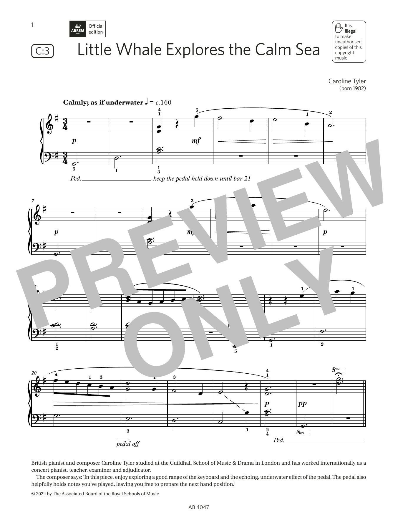 Download or print Caroline Tyler Little Whale Explores the Calm Sea (Grade 1, list C3, from the ABRSM Piano Syllabus 2023 & 2024) sheet music, chords and digital score arranged for Piano Solo. This Classical score includes 1 page(s).