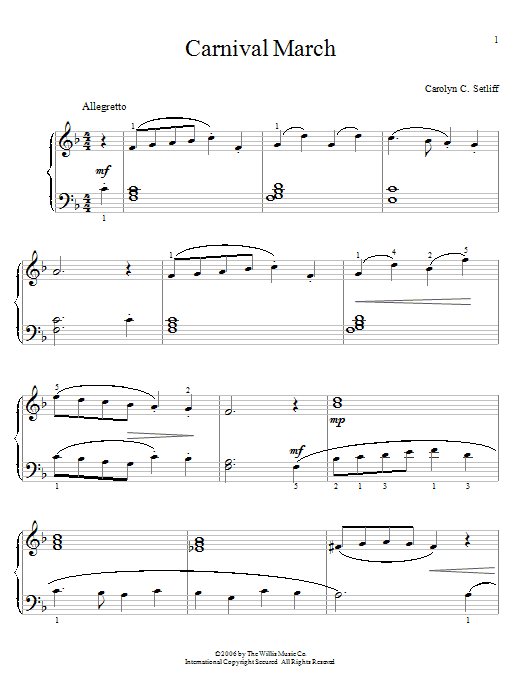 Download or print Carolyn C. Setliff Carnival March sheet music, chords and digital score arranged for Educational Piano. This Children score includes 3 page(s).