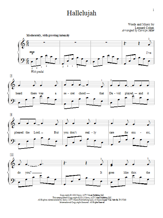 Download or print Leonard Cohen Hallelujah (arr. Carolyn Miller) sheet music, chords and digital score arranged for Educational Piano. This Classical score includes 2 page(s).