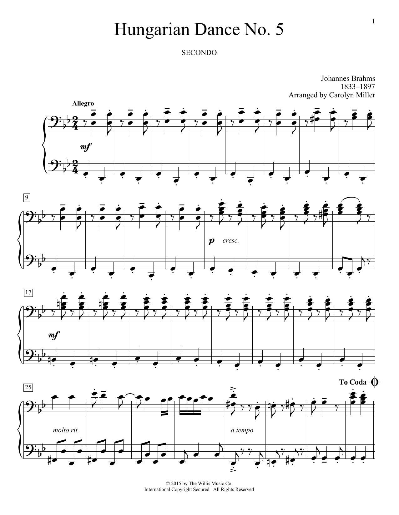 Download or print Johannes Brahms Hungarian Dance No. 5 (arr. Carolyn Miller) sheet music, chords and digital score arranged for Piano Duet. This Children score includes 4 page(s).