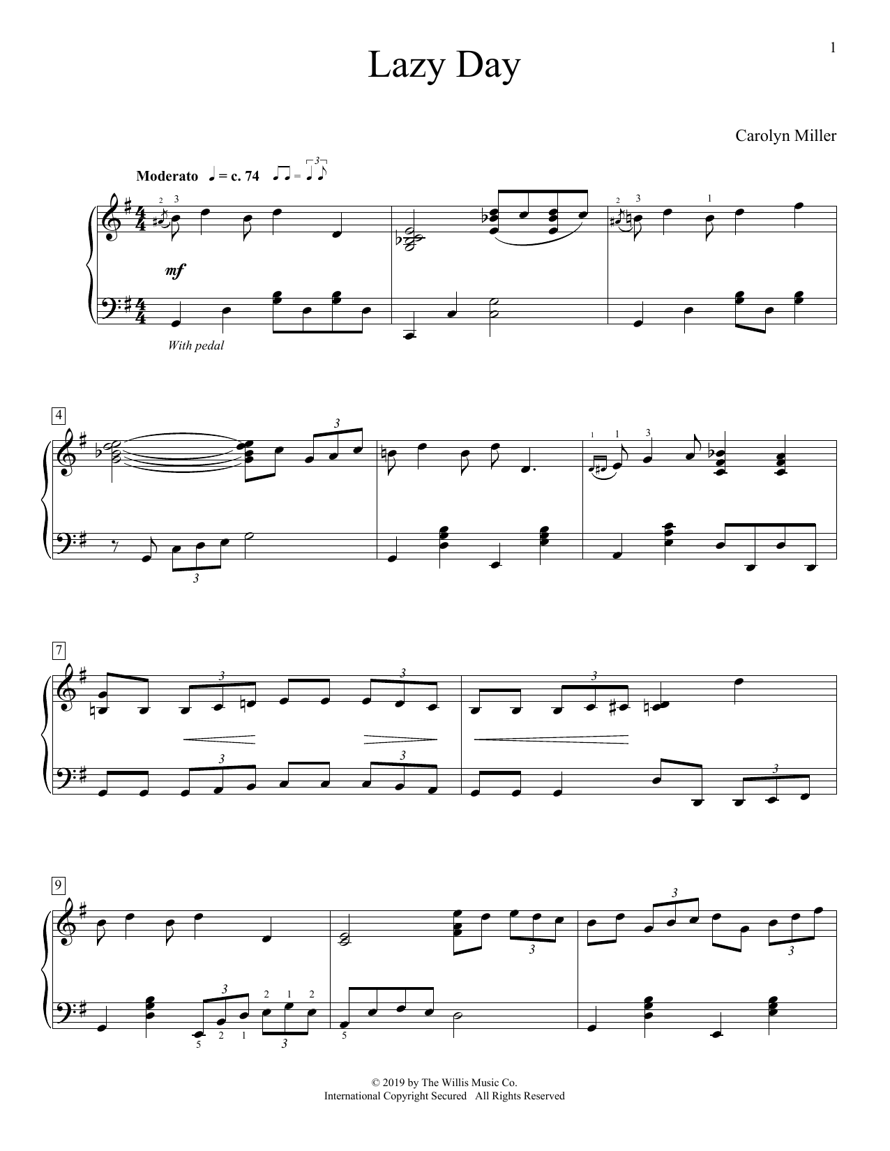 Download or print Carolyn Miller Lazy Day sheet music, chords and digital score arranged for Educational Piano. This Instructional score includes 3 page(s).