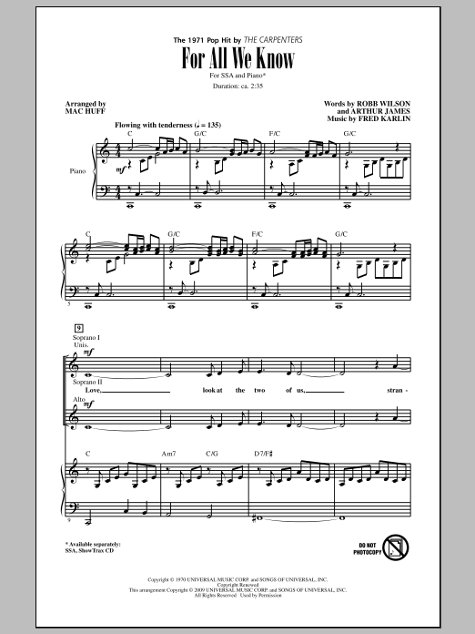 Download or print Carpenters For All We Know (arr. Mac Huff) sheet music, chords and digital score arranged for SSA Choir. This Pop score includes 7 page(s).