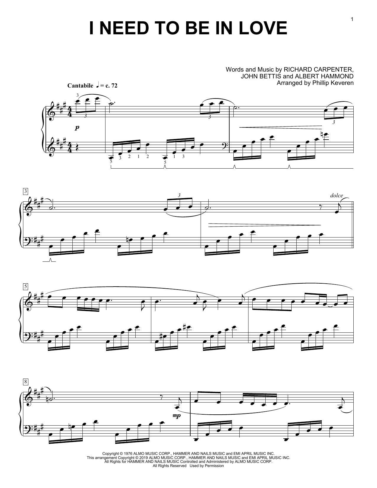 Download or print Carpenters I Need To Be In Love (arr. Phillip Keveren) sheet music, chords and digital score arranged for Piano Solo. This Pop score includes 4 page(s).