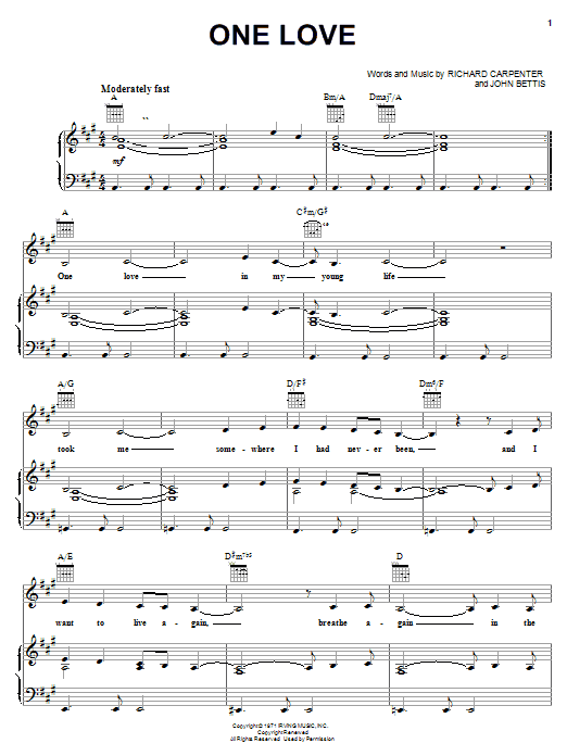 Download or print Carpenters One Love sheet music, chords and digital score arranged for Piano, Vocal & Guitar Chords (Right-Hand Melody). This Love score includes 5 page(s).