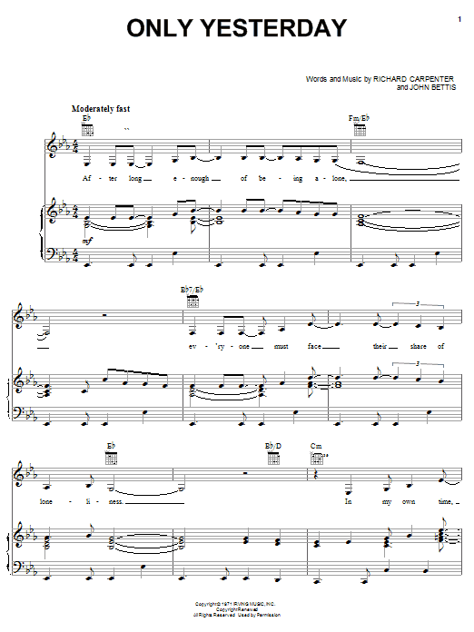 Download or print Carpenters Only Yesterday sheet music, chords and digital score arranged for Big Note Piano. This Pop score includes 7 page(s).