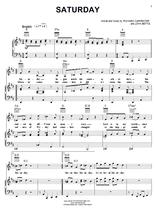 Download or print Carpenters Saturday sheet music, chords and digital score arranged for Piano, Vocal & Guitar Chords (Right-Hand Melody). This Pop score includes 3 page(s).
