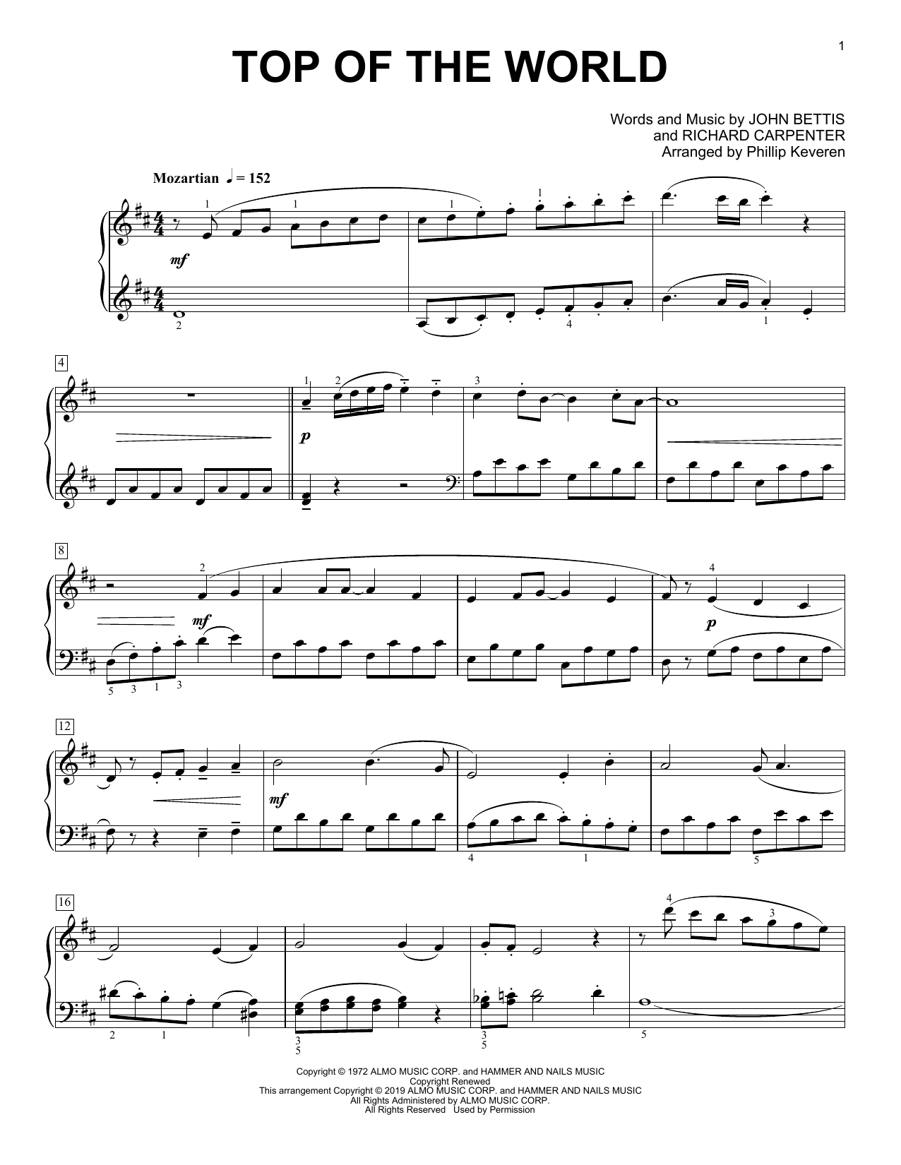 Download or print Carpenters Top Of The World (arr. Phillip Keveren) sheet music, chords and digital score arranged for Piano Solo. This Pop score includes 3 page(s).