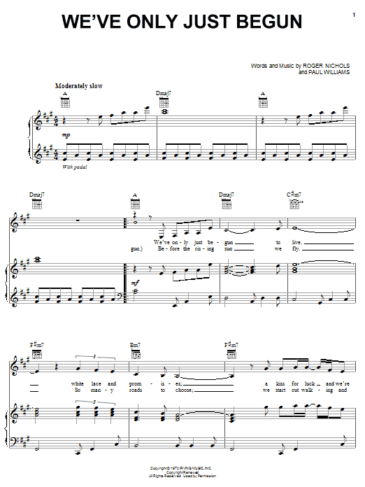 Download or print Carpenters We've Only Just Begun sheet music, chords and digital score arranged for Really Easy Piano. This Pop score includes 2 page(s).