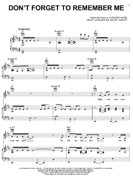 Download or print Carrie Underwood Don't Forget To Remember Me sheet music, chords and digital score arranged for Piano, Vocal & Guitar Chords (Right-Hand Melody). This Country score includes 7 page(s).