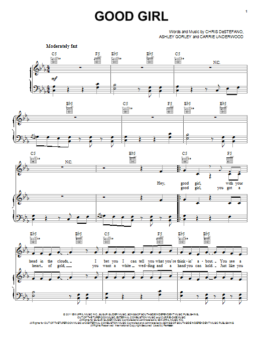 Download or print Carrie Underwood Good Girl sheet music, chords and digital score arranged for Piano, Vocal & Guitar Chords (Right-Hand Melody). This Country score includes 7 page(s).