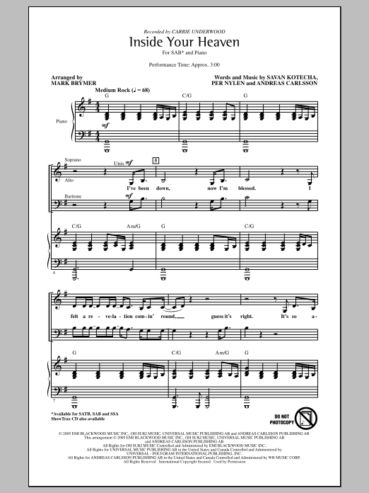 Download or print Mark Brymer Inside Your Heaven sheet music, chords and digital score arranged for SAB Choir. This Pop score includes 7 page(s).