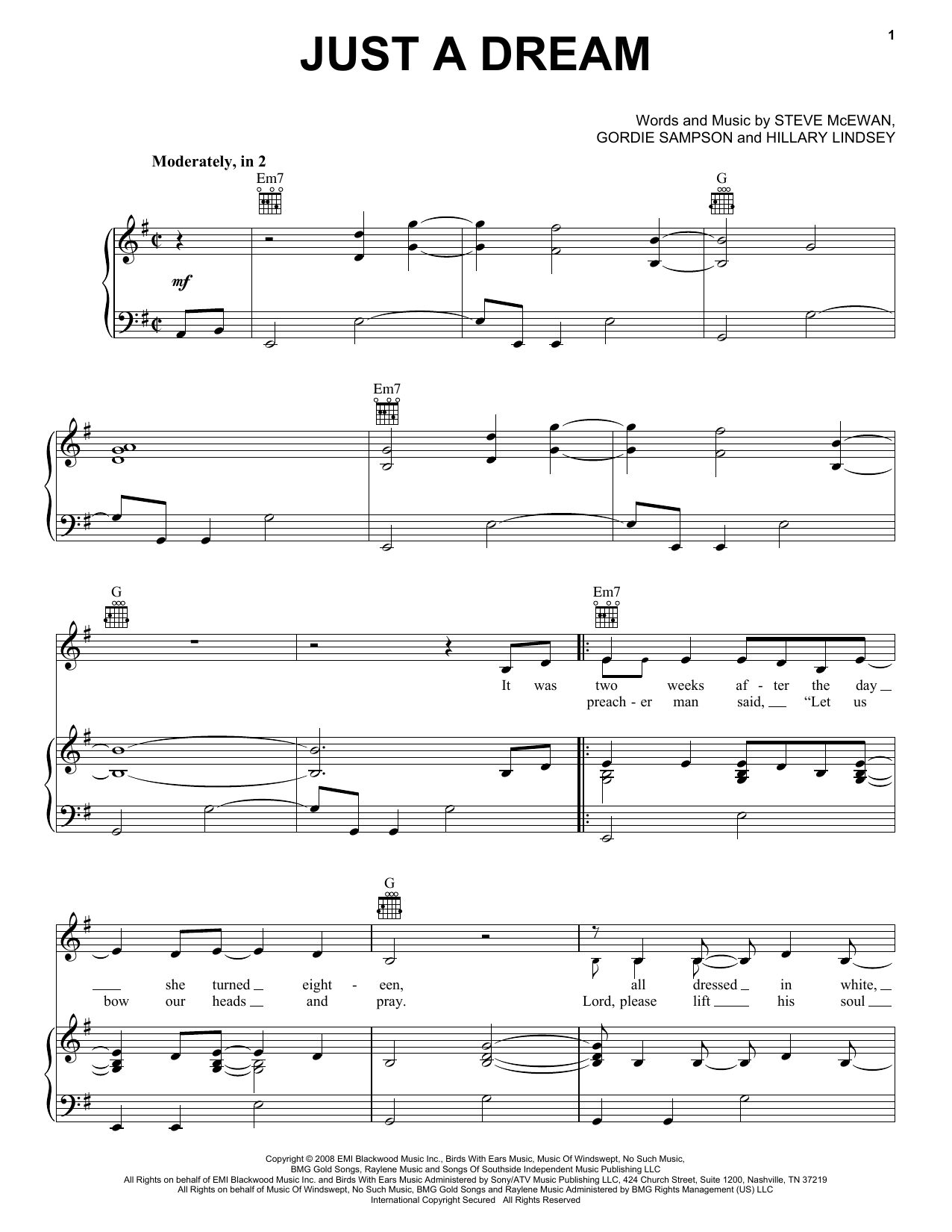 Download or print Carrie Underwood Just A Dream sheet music, chords and digital score arranged for Piano, Vocal & Guitar Chords (Right-Hand Melody). This Country score includes 8 page(s).