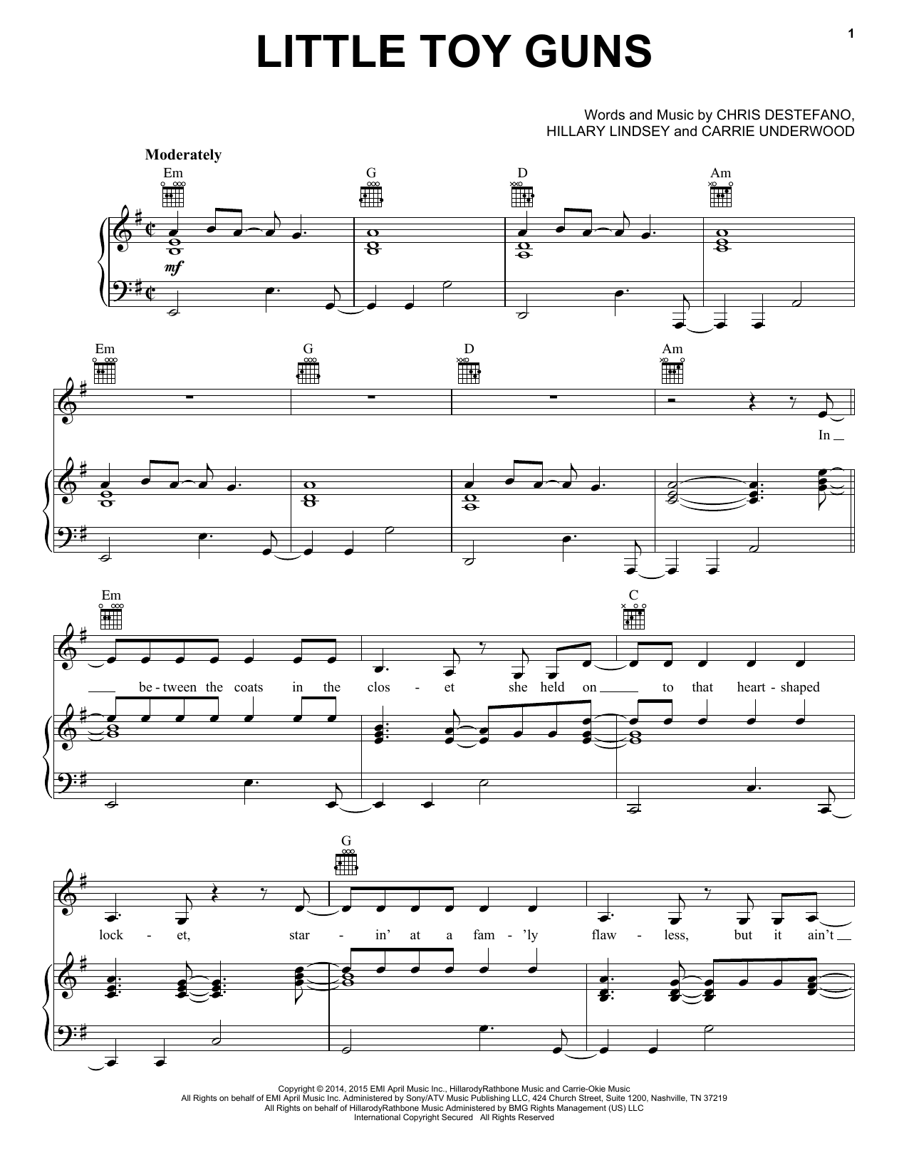 Download or print Carrie Underwood Little Toy Guns sheet music, chords and digital score arranged for Piano, Vocal & Guitar Chords (Right-Hand Melody). This Country score includes 9 page(s).