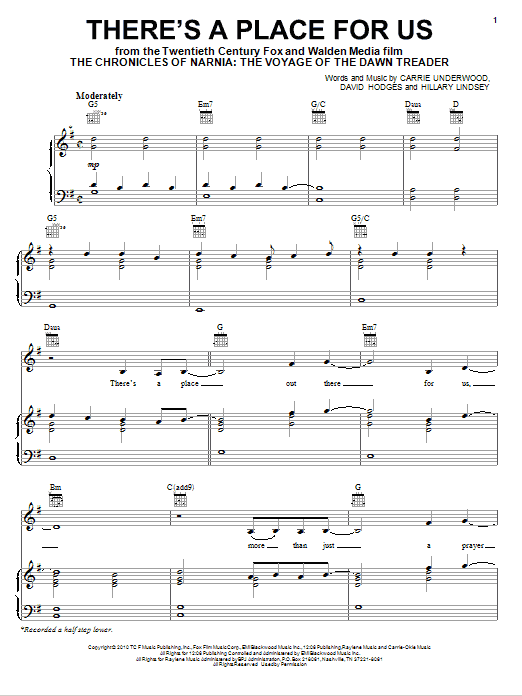 Download or print Carrie Underwood There's A Place For Us sheet music, chords and digital score arranged for Piano, Vocal & Guitar Chords (Right-Hand Melody). This Film/TV score includes 8 page(s).