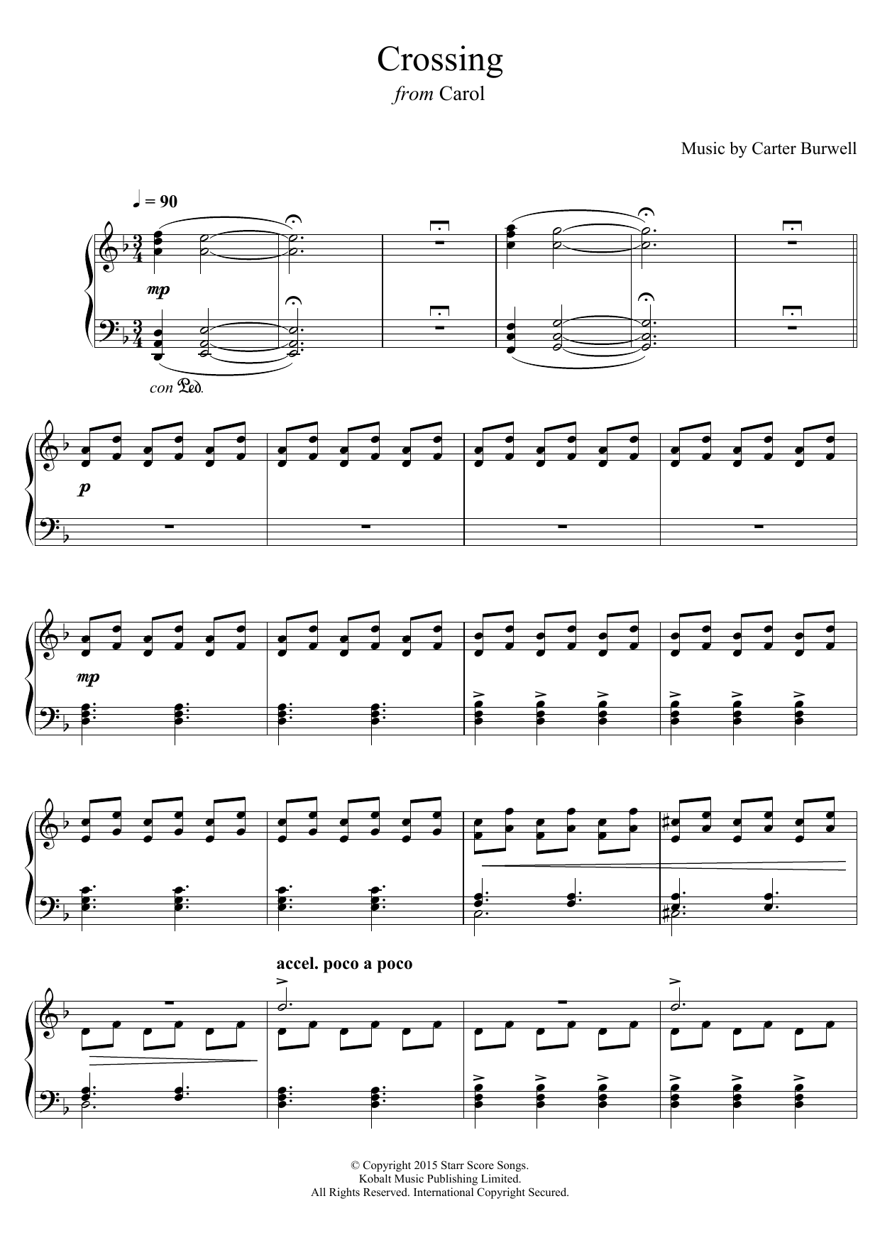 Download or print Carter Burwell Crossing (from 'Carol') sheet music, chords and digital score arranged for Piano Solo. This Film/TV score includes 2 page(s).