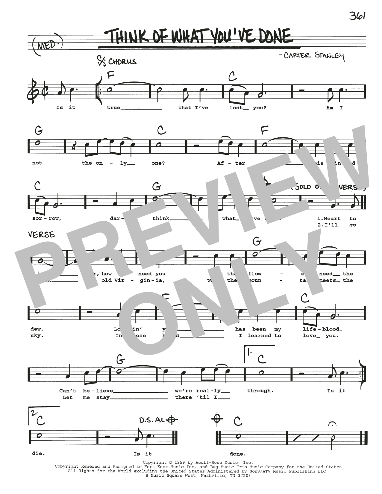 Download or print Carter Stanley Think Of What You've Done sheet music, chords and digital score arranged for Real Book – Melody, Lyrics & Chords. This Jazz score includes 1 page(s).