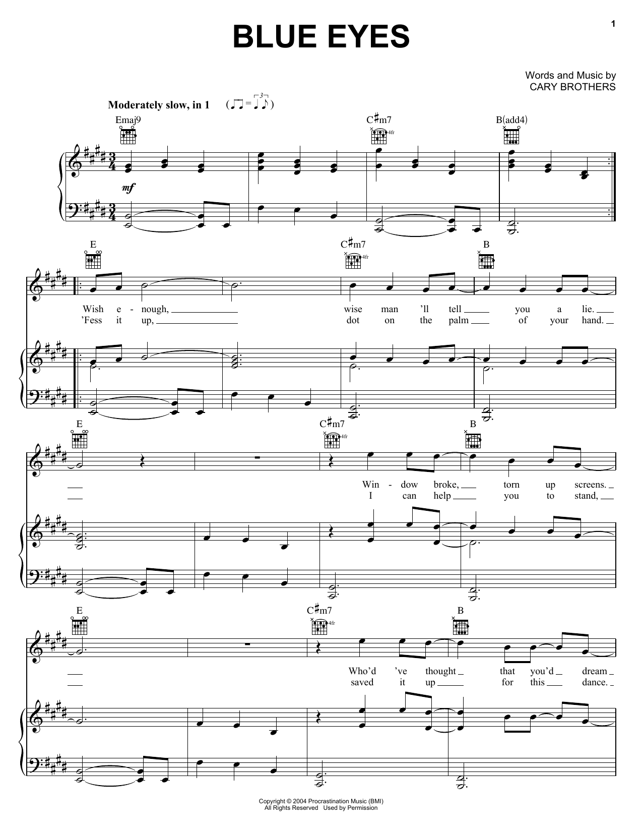 Download or print Cary Brothers Blue Eyes sheet music, chords and digital score arranged for Piano, Vocal & Guitar Chords (Right-Hand Melody). This Pop score includes 7 page(s).