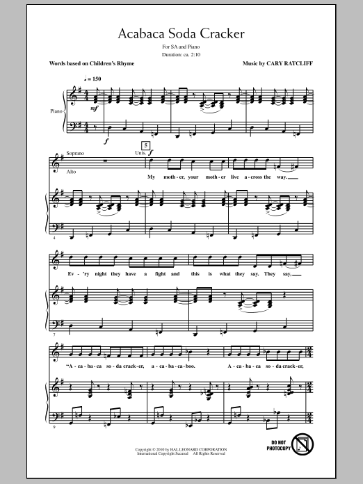 Download or print Cary Ratcliff Acabaca Soda Cracker sheet music, chords and digital score arranged for 2-Part Choir. This Children score includes 9 page(s).
