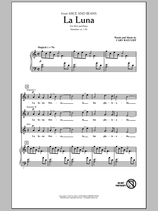 Download or print Cary Ratcliff La Luna sheet music, chords and digital score arranged for SSA Choir. This Spanish score includes 7 page(s).