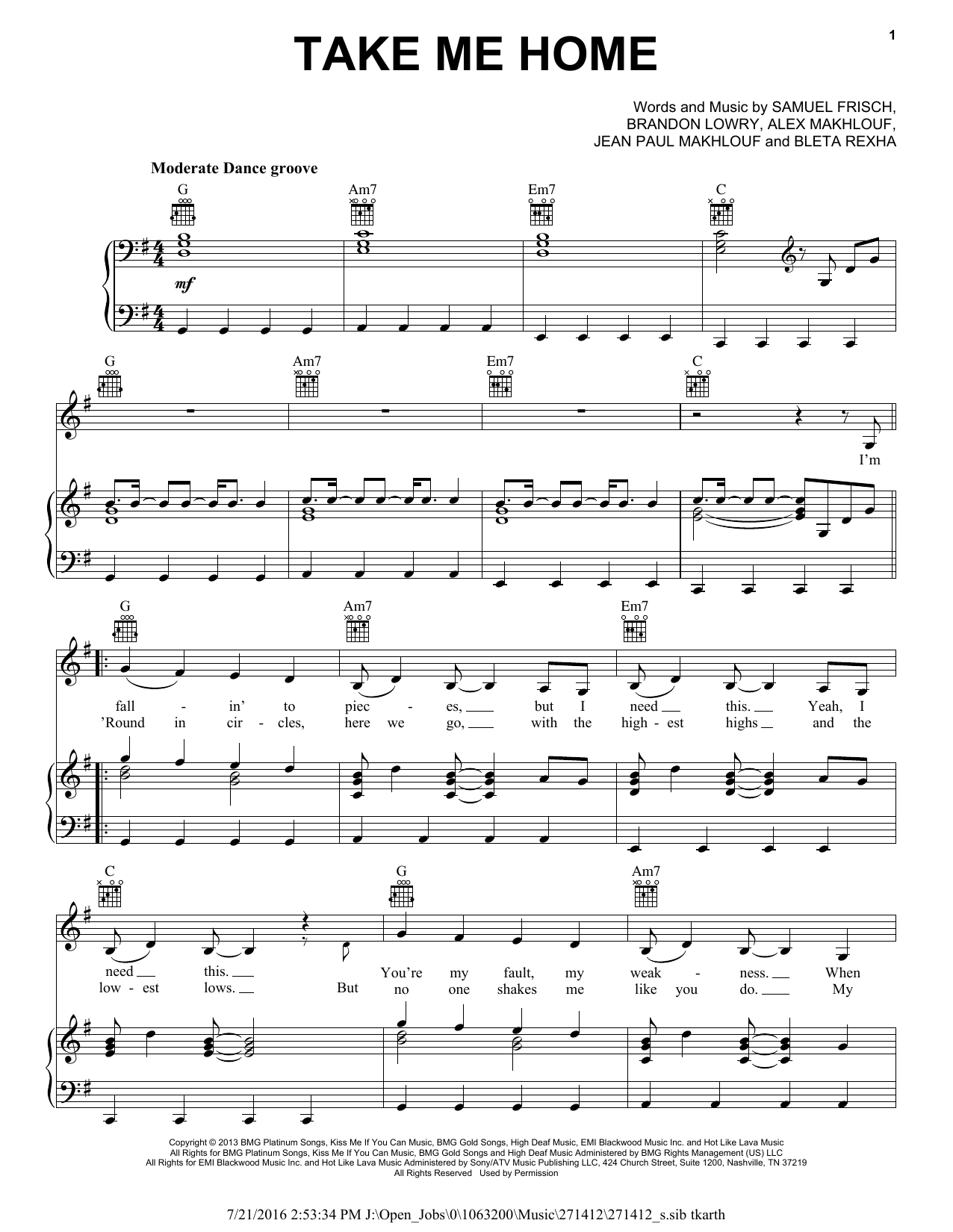 Download or print Cash Cash feat. Bebe Rexha Take Me Home sheet music, chords and digital score arranged for Piano, Vocal & Guitar Chords (Right-Hand Melody). This Pop score includes 4 page(s).