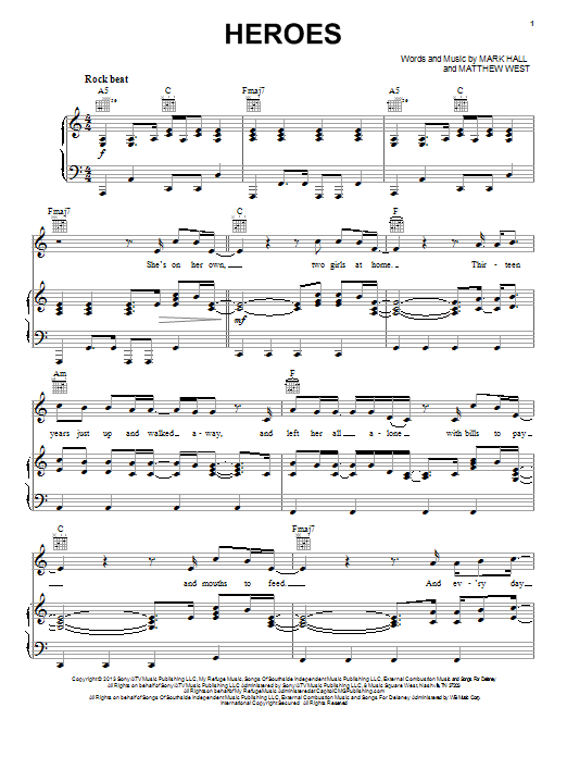 Download or print Casting Crowns Heroes sheet music, chords and digital score arranged for Piano, Vocal & Guitar Chords (Right-Hand Melody). This Christian score includes 8 page(s).